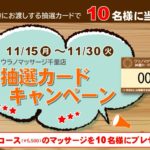 こんにちは、ウラノマッサージ曽根店です。 7月に平日限定で行いました抽選カードキャンペーン、多くのお客様にご来店頂きましてありがとうございました! 厳正なる抽選の結果、当選番号が決定しましたのでお知らせいたします。 以上の10名の当選されたお客様、おめでとうございます! 抽選カードがそのままマッサージ券となりますので、抽選カードにお名前をご記入の上、施術当日受付までお持ち下さい。 ※マッサージ券の使用期限は、2021年11月末日までになりますのでご注意ください。 \ 最新情報をチェック /
